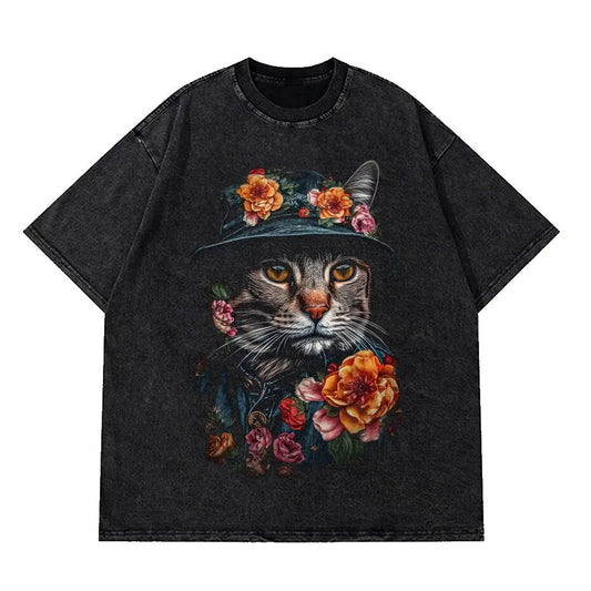 Black Washed Vintage T-Shirt With Sophisticated Gentleman Cat And Flower Ornaments