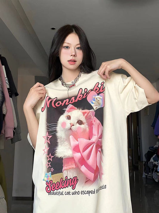 Oversize barbiecore Pink Cat T-shirt