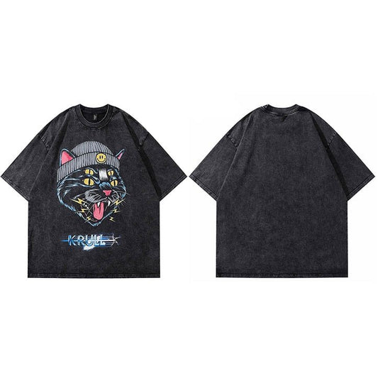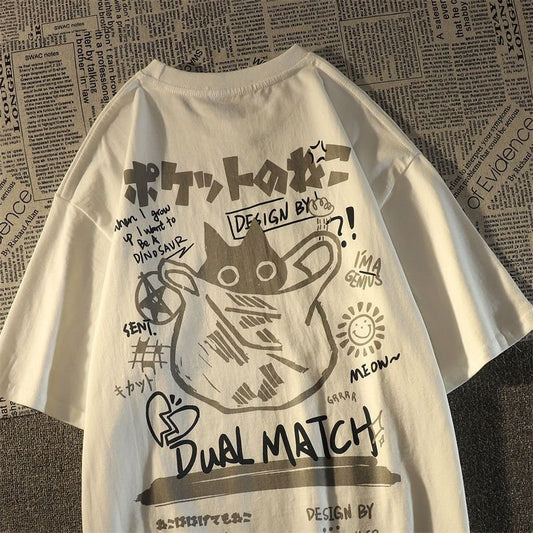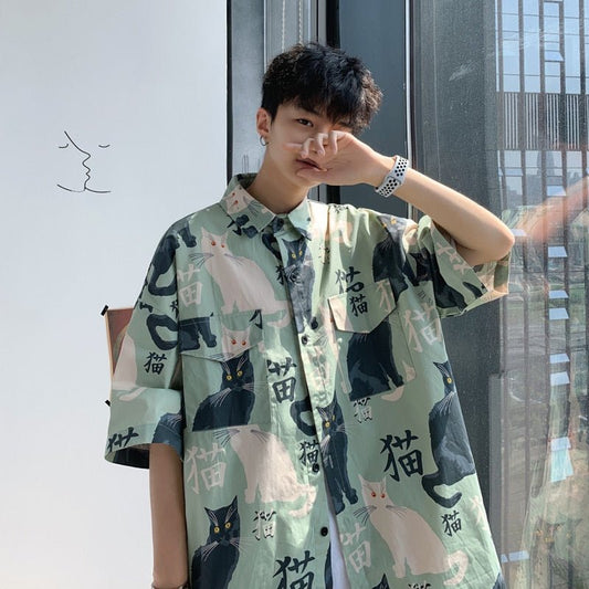 Harajuku Style Men's cat shirt with Japanese Kanji