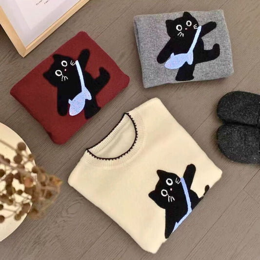 'Sneaky Black Cat' Fluffy Pullover Sweater
